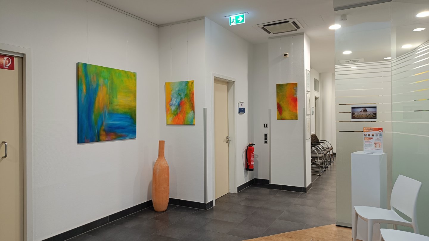 Seit 2021 arbeite ich als künstlerische Leitung für die Fachinternisten Aschaffenburg. Die sehr große Praxis hat einen onkologischen und einen diabetologischen Schwerpunkt mit verschiedenen Untersuchungs-, Behandlungs-, und Besprechungsräumen und mehreren Wartebereichen. Mein Auftrag ist es, Ausstellungen zu konzipieren und umzusetzen, die ca. alle zwei Jahre wechseln. Inhaltlich sollten die Kunstwerke beruhigend wirken, Hoffnung tragen und ermutigend sein. Ich habe seither zwei große Ausstellungen mit bis zu 105 Originalen verschiedener Künstler kuratiert, die für die Ausstellungsdauer angemietet wurden. Im Laufe der Zeit wurden einige der ausgestellten Werke zur dauerhaften Hängung angekauft. Der Kundenwunsch zur letzten Kuration war es, auch Kunstdrucke von Gemälden zu integrieren.