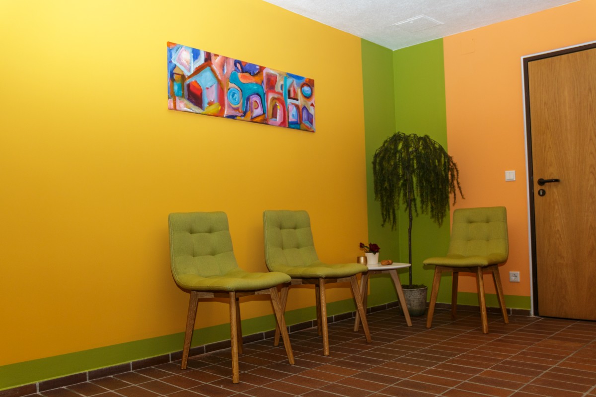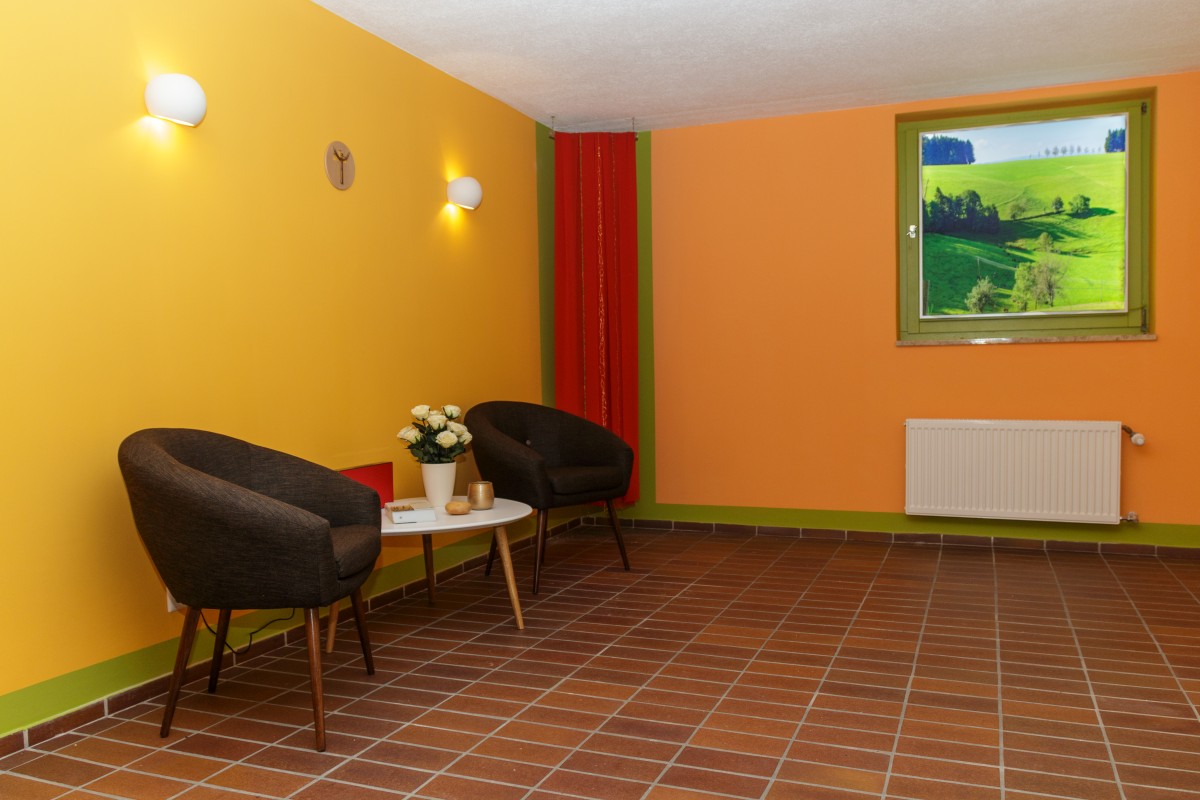 The farewell room of the nursing home is located in the basement and was a mousy grey and cold room with a barred window. In 2017, I was commissioned to transform it into a warm and welcoming space where mourners could say goodbye to their loved ones in a comforting atmosphere. This was a comprehensive interior design project, with the exception of the flooring.