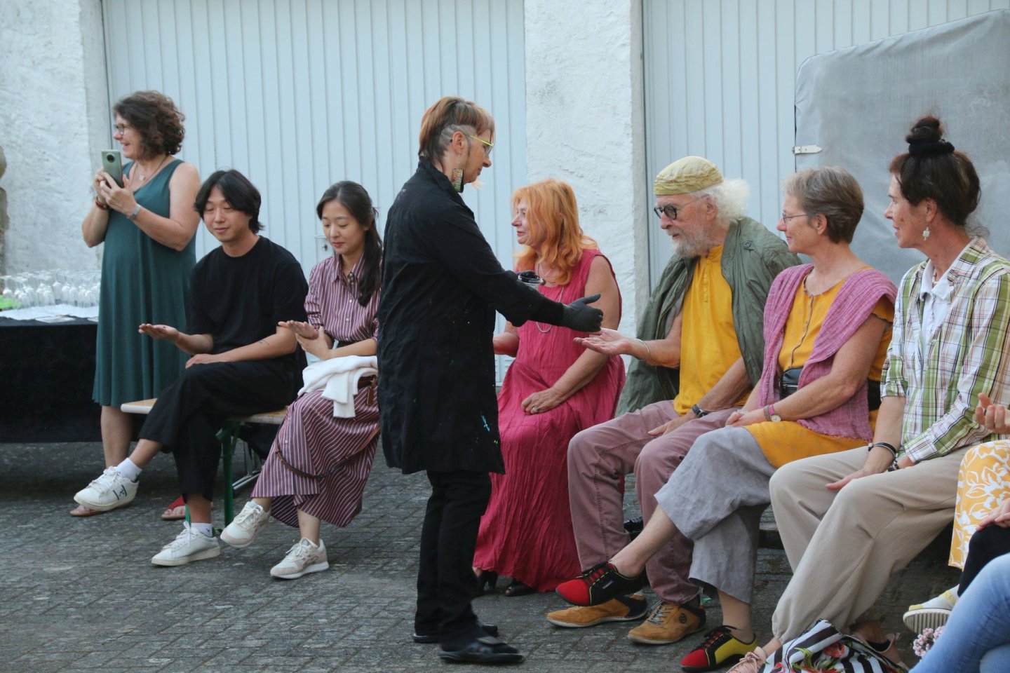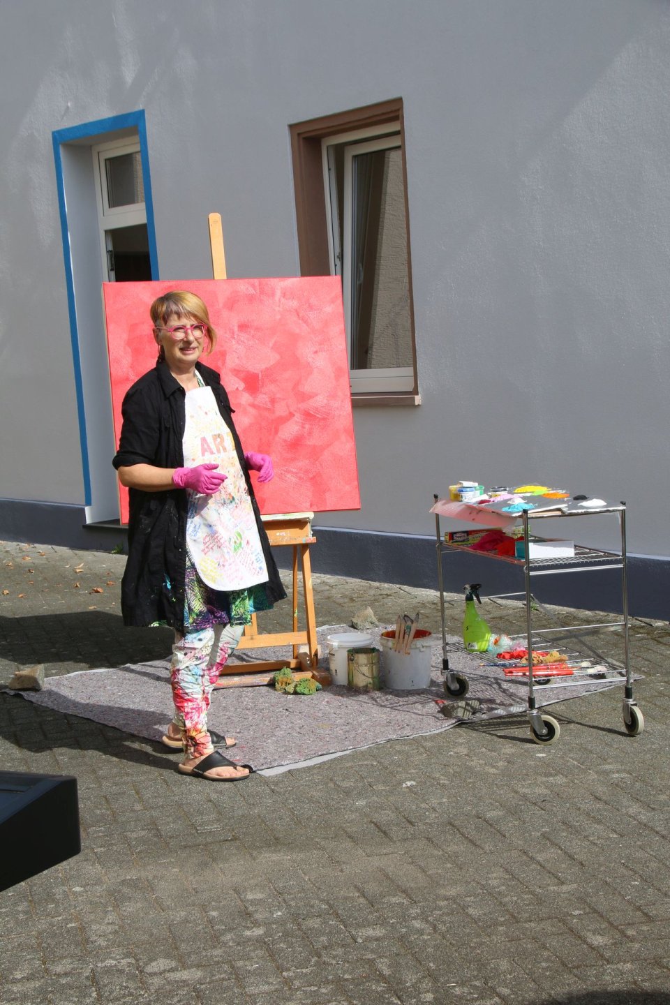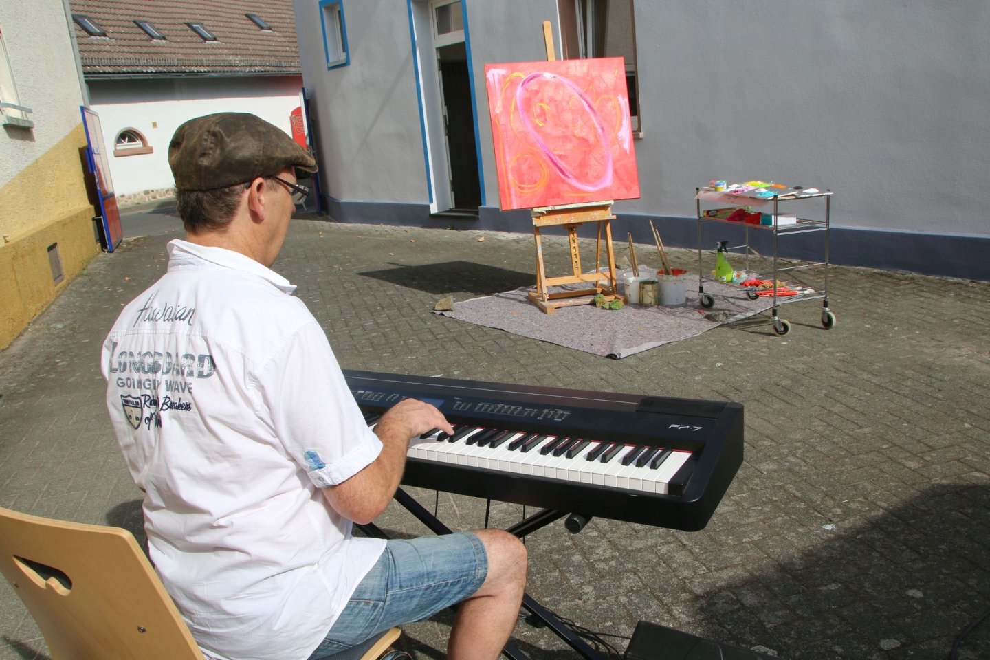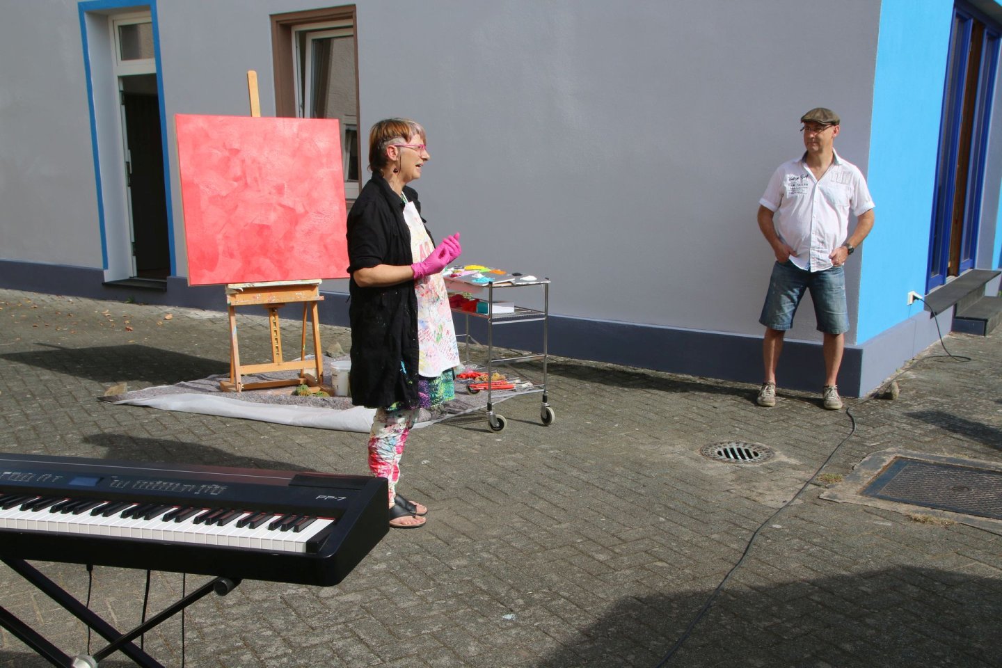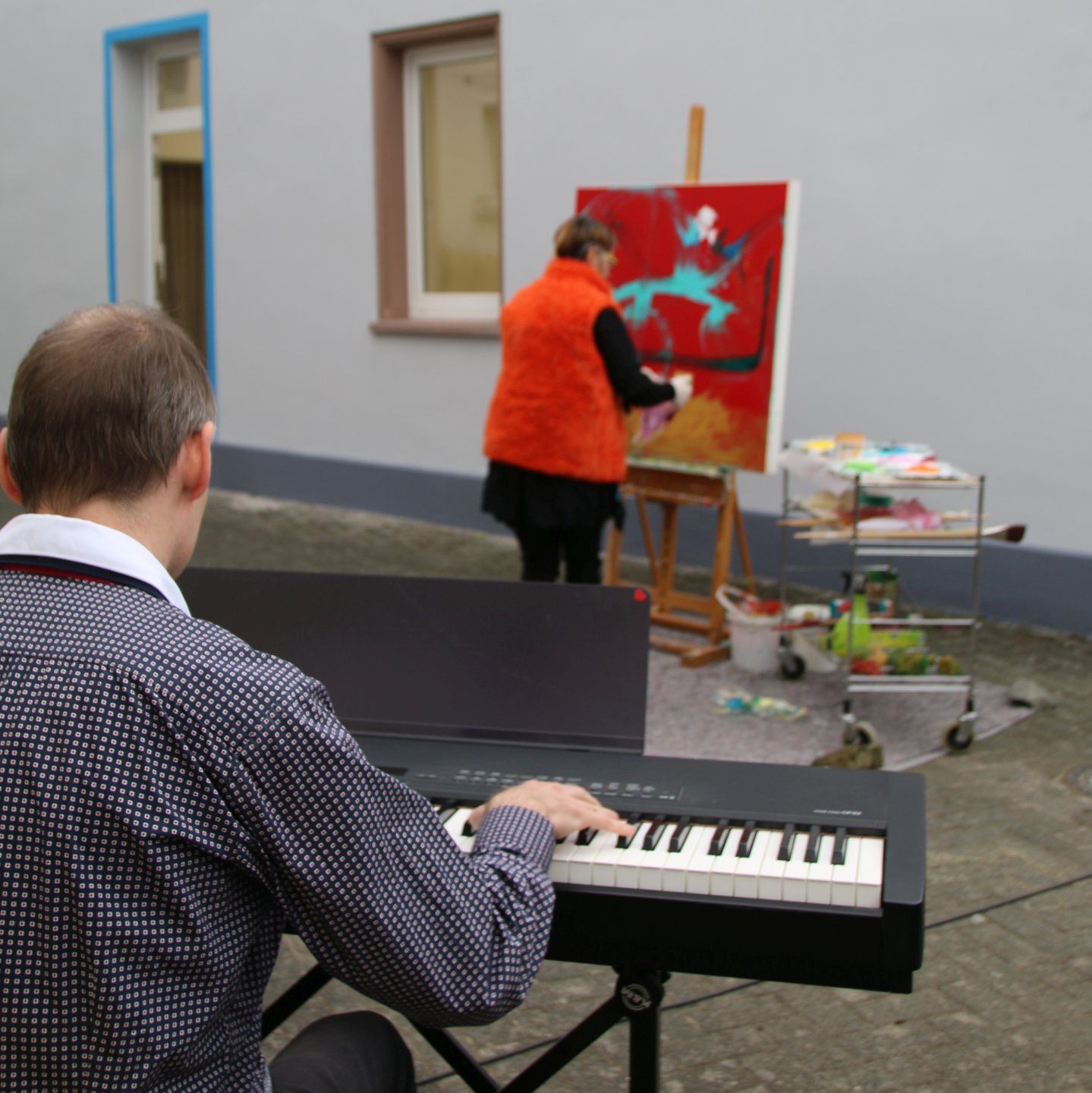 When I paint in an ensemble with a musician, the performance is preceded by agreements. For example, we discuss who pays attention to whom. The musician either makes my painting audible or accompanies it, or I make his music visible, and both can happen reciprocally. When we perform as an ensemble, we usually perform in three acts. i.e. three canvases and three different pieces of music in approx. 15 minutes per act. The performance can be based on a theme or each act can stand on its own.