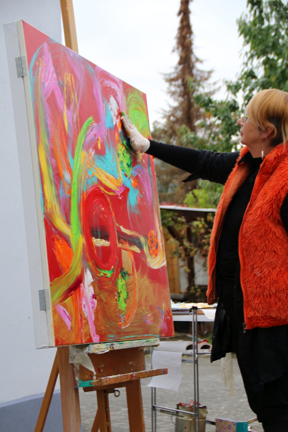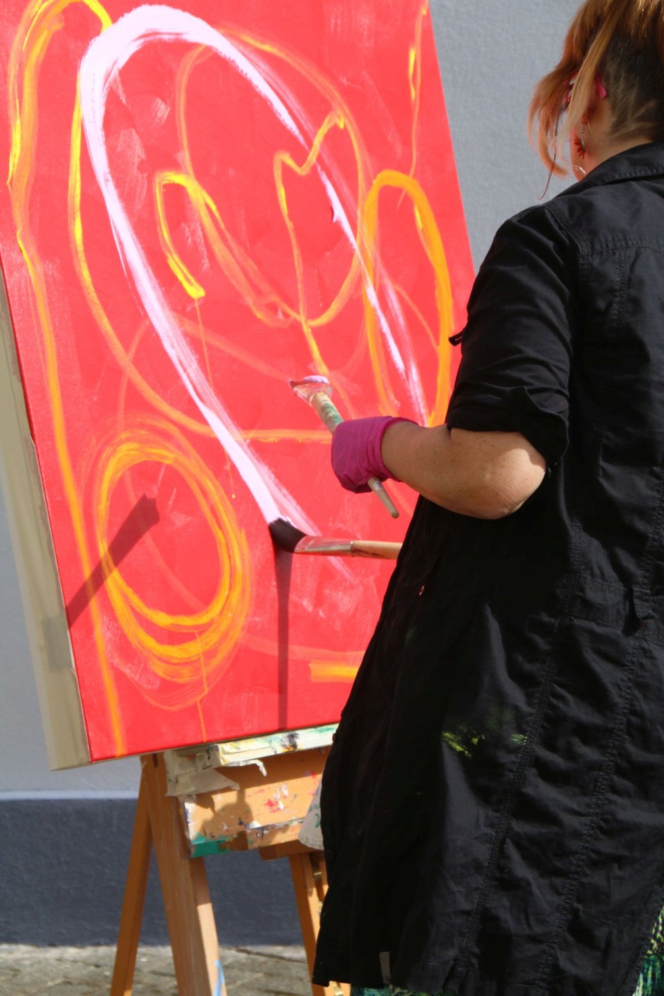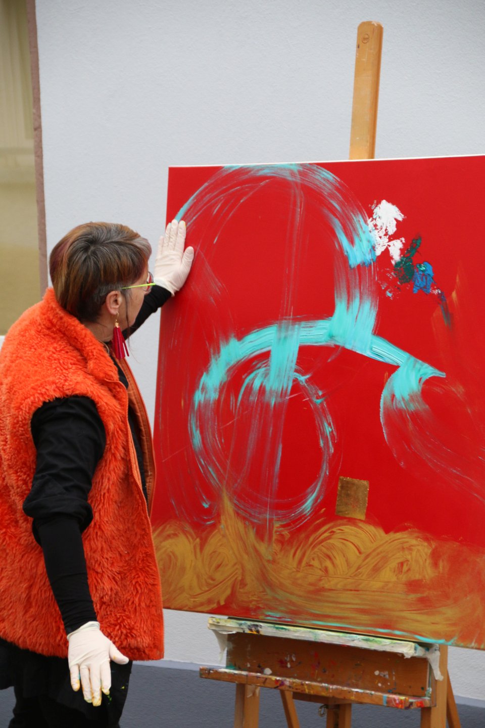 For me, live painting is a powerful, beautiful and challenging act of creation. I usually paint directly on the canvas with both hands or with natural sponges. Sometimes I start with a dance of two brushes. For me, live painting is always an instantaneous event that I have not rehearsed beforehand. I prepare for it by choosing the color palette, painting tools and underpainting. Regardless of whether I paint with a musician, a band or alone in front of an audience, I give myself completely to this moment of happening. While painting, the audience is directly involved in the creation of the painting. The whole of humanity follows the movement, the color, the music and becomes a part of it. There lies a secret through the power of which the audience can be picked up and touched deep in their heart, mind, soul and body.