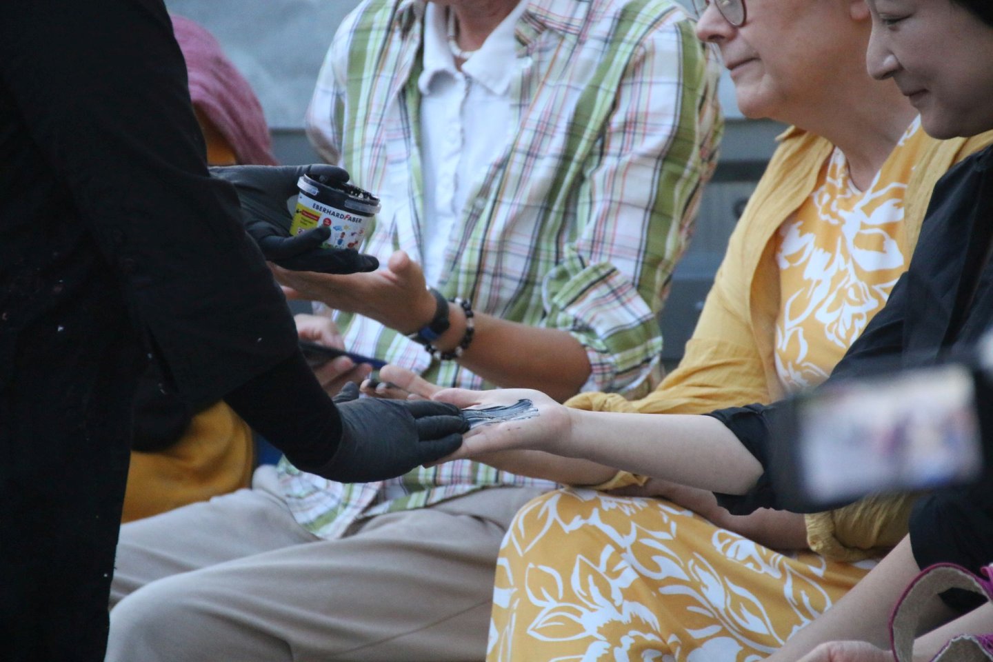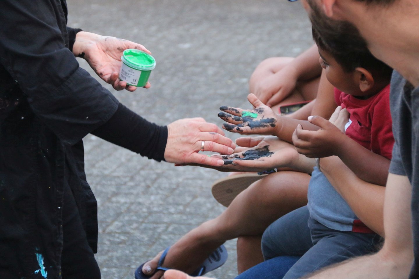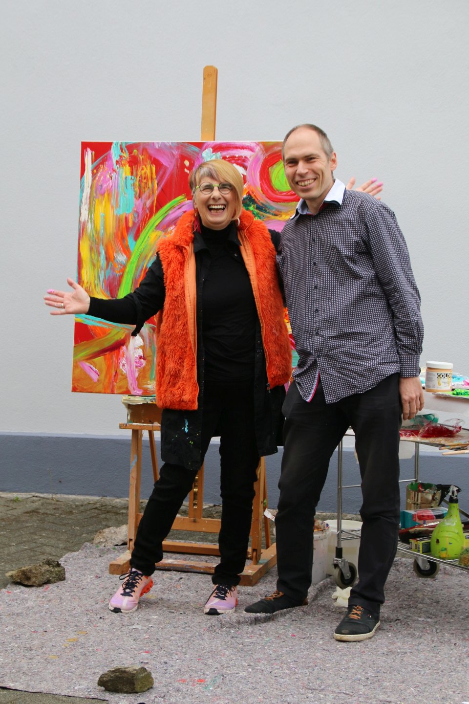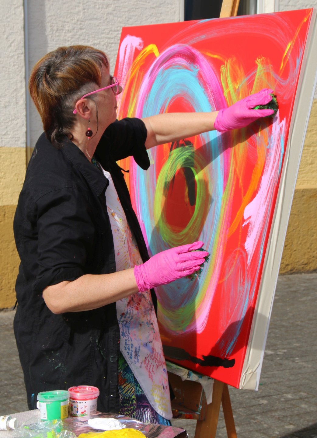 For me, live painting is a powerful, beautiful and challenging act of creation. I usually paint directly on the canvas with both hands or with natural sponges. Sometimes I start with a dance of two brushes. For me, live painting is always an instantaneous event that I have not rehearsed beforehand. I prepare for it by choosing the color palette, painting tools and underpainting. Regardless of whether I paint with a musician, a band or alone in front of an audience, I give myself completely to this moment of happening. While painting, the audience is directly involved in the creation of the painting. The whole of humanity follows the movement, the color, the music and becomes a part of it. There lies a secret through the power of which the audience can be picked up and touched deep in their heart, mind, soul and body.